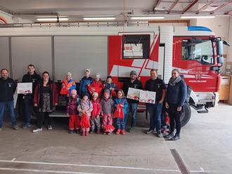 Die Kinder bedankten sich bei den Feuerwehrmännern mit selbstgebastelten Leinwänden und bekamen sogar selbst noch eine Kleinigkeit geschenkt – jedes Kind erhielt einen Turnbeutel mit einem Buch und einer Feuerwehrtasse.