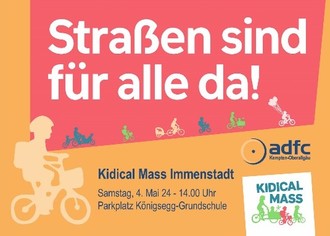 Mit dieser „kidical mass“( ein international gebräuchlicher Begriff für eine kindgerechte Demonstration auf Fahrrädern) möchte der ADFC mit seinen Partnern für eine sichere Rad-Infrastruktur in Immenstadt sowie für mehr gegenseitige Rücksichtnahme aller Verkehrsteilnehmer werben. ADFC-Organisator Stefan Wißmüller: “Naturgemäß stehen bei der Kidical mass am 4.Mai unsere radelnden Kinder und Jugendlichen im Fokus, die als schwächste Glieder im Verkehr besonderen Schutz bedürfen.“