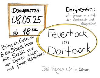 Auch in diesem Jahr gibt es wieder den Dorfhock des Dorfvereins Buchenberg. Der erste findet am Donnerstag, den 8.5.2025 ab 18.00 Uhr im Dorfpark statt - zum gemeinsamen Austausch, Ideen schmieden, Boule spielen an der neuen Boulebahn und gemütlich am Lagerfeuer sitzen.