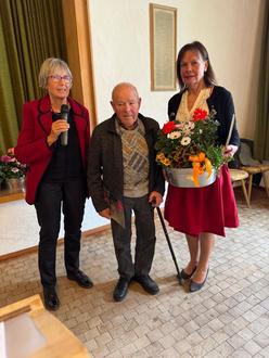 Ludwig Meyer feierte 60 Jahre Mitgliedschaft im Gartenbauverein Buchenberg. Es gratulierten die Vorsitzende Angelika Heringlehner (links) und die Kreisvorsitzende Roswitha Weißenbach (rechts).