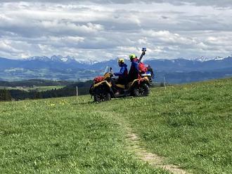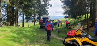 15.14Uhr: Wieder ein Bikesturz mit gleichem Verletzungsbild, dieses Mal im Bikepark Eschach. Bei einem E-Mountainbikekurs auf einem Trail neben dem Skigebiet ist eine Frau gestürzt. Der Notarzt war schon vor Ort und hat die Patientin medikamentös ruhig gestellt. Im Anschluss wurde geschient, umgelagert und wieder mittels Gebirgstrage abtransportiert. Die Einsatzfahrzeuge Amarok und Quad konnten dabei sehr nah durch unwegsames Gelände an die Einsatzstelle fahren, dank der Geländetauglichkeit.