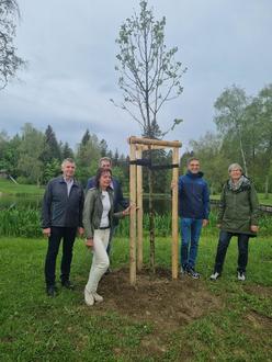 Karl Bayrhof und Roswitha Weißenbach vom Kreisverband, Christian Zinth als Vertreter der Gemeinde, Kreisfachberater Bernd Brunner und die Vorsitzende des Gartenbauvereins Buchenberg, Angelika Heringlehner freuen sich über den schönen Baum.