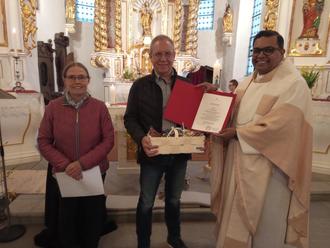 Pfarrer Sanoj überreichte eine Urkunde des Bistums Augsburg als Anerkennung für ihre Verdienste. Im Namen der Kirchenverwaltung bedankte sich Maria Schmid mit einem Geschenk und hielt einen Rückblick auf die vergangenen 18 Jahre in Versform: