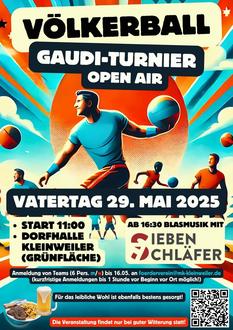 Am Donnerstag, den 29. Mai 2025 (Vatertag), lädt der Förderverein der Musikkapelle Kleinweiler-Hofen erstmals zum Völkerball-Gaudi-Turnier unter freiem Himmel ein. Das spaßorientierte Turnier findet auf der Grünfläche bei der Dorfhalle Kleinweiler statt und beginnt um 11:00 Uhr. Teams mit jeweils sechs Personen können sich ab sofort bis zum Fest anmelden – auch kurzfristig bis eine Stunde vor Turnierbeginn direkt vor Ort.