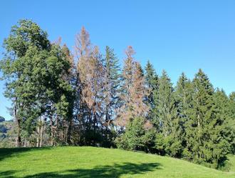 Abgestorbene Fichten nach Borkenkäferbefall: Wenn die Fichtenkronen rot werden, sind die Käfer schon wieder ausgeflogen.
