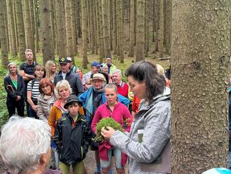 Vom Treffpunkt am Bienenhaus aus ging es zunächst durch ein malerisches Waldstück hinein in das Hochmoor. Dort veranschaulichte Moorführerin Barbara Birk die beeindruckende Funktion des Torfmooses, das in der Region liebevoll „Sternenmoos“ genannt wird. Sie zeigte, wie diese uralten, bis zu 9000 Jahre alten Pflanzen wie ein natürlicher Schwamm wirken und große Mengen Wasser speichern. „Würde dieses Moor für Windkraftanlagen abgebaut, gingen nicht nur Jahrtausende Naturgeschichte verloren – es würde auch Unmengen an CO₂ freigesetzt“, erklärte Birk eindrucksvoll.