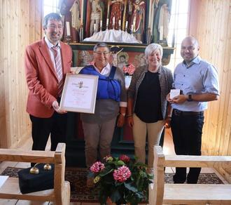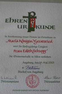 Im Rahmen des Kapellen-Festes zu Ehren Maria Königin wurde Frau Edith Schugg, der Mesnerin der Kapelle, die Mesnermedaille in Silber für fünzigjährige Tätigkeit im Gotteshaus verliehen. Der Diözesanleiter Klaus Probst kam extra aus Augsburg, um die Ehrung durchzuführen. Neben Pater Sojesh gratulierte auch Frau Rosmarie Mohr von der Kirchenverwaltung und überraschte u.a. mit einem Gedicht die Jubilarin.