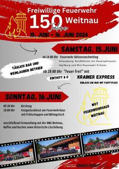 Das Festprogramm startet am 15. Juni 2024 ab 14:00 Uhr mit einem „Feuerwehr Aktionsnachmittag“ und ab 20:00 Uhr heißt es „Feuer frei“ mit dem KRAINER EXPRESS.