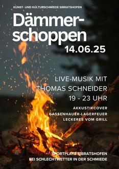 Die Kunst- und Kulturschmiede lädt heute, am Samstag, 14. Juni, ab 19 Uhr zu einem Dämmerschoppen mit Live-Musik und Lagerfeuer ein. Der Musiker Thomas Schneider begleitet den Abend mit Akkustikcovern – Gassenhauer Lagerfeuer – und sorgt für Stimmung und Gemütlichkeit. Zum Essen gibt es Leckeres vom Grill. Die Veranstaltung findet auf dem Sportplatz in Sibratshofen statt – bei Schlechtwetter in der Schmiede in der Hauptstraße 4.
