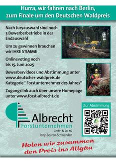 Onlinevoting noch bis 15.Juni 2025 – alle Infos mit Bewerbungsvideo und Zugang zur Abstimmung unter: www.deutscher-Waldpreis. de oder über die Homepage www.forst-albrecht.de