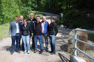 Freuen sich, dass der Weg am Scheidenbach wieder nutzbar ist: (von links) Waltenhofens Bürgermeister Stefan Sommer, Grundstückseigentümer Wolfgang Schuster und Elisabeth Prinz, Förster Michael Balk, Bernhard Schmieder, Abteilungsleiter am AELF und die Grundstückseigentümer Fidel Hörburger und Albert Günther.