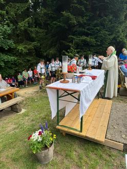 Eine wiederrum wunderschöne Bergmesse erlebten ca. 115 Enzianer/innen und Gäste auf dem Hausberg von Sibratshofen. Pfarrer Erwin Ruchte zelebrierte die Messe umrahmt von Alphorn und Blech aus Ebratshofen. Ruchte beklagte in seiner Predigt die aktuellen Kriege und mahnte zum Frieden! Vorstand Helmut Heurung bedankte sich zum Schluss bei allen Beteiligten und lud zur Brotzeit ein. Er wünschte einen guten Nachhauseweg bevor der Regen kam……