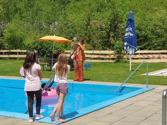 Der musikalische Tausendsassa Mathias Schriefl spielte bei der Eröffnung am Beckenrand im Freibad Seltmans. Hier werden ab 4. Juli die Kurse stattfinden.