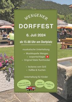 Am Samstag, den 6. Juli 2024, ist es wieder soweit: Das traditionelle Dorffest in Wengen startet um 15:00 Uhr auf dem Dorfplatz. Die Dorfvereine Wengen laden alle herzlich ein, gemeinsam einen tollen Tag zu verbringen.