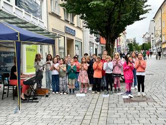 25 Schülerinnen und Schüler der Klassen zwei bis vier reisten mit dem Bus nach Kempten und präsentierten voller Freude im Rahmen des 17. Schulchorsingens vor Publikum ihre gelernten Lieder in der Fußgängerzone. Begleitet wurden sie dabei auf dem Piano von ihrer Chorlehrerin Anke Meyer. Unter dem Motto „Kinder singen für Kinder in der Welt“ wurde für den Bau einer Schule in Äthiopien gesammelt.