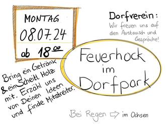 Der nächste Dorfhock in Buchenberg findet am Montag, 08.07.24, ab 18.00 Uhr im Dorfpark statt - zum Austausch, neue Leute Kennenlernen, Ideen für ein gemeinsames Miteinander entwickeln oder einfach nur Ratschen. Bring dir was zu essen und trinken mit und ein Scheit Holz fürs Lagerfeuer.