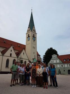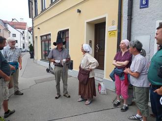Vom „Gerichtsplatz zum Beinhaus“ ging es für die Kolpingsfamilie Buchenberg bei einer Themen-Stadtführung in Kempten. Unsere Stadtführerin war direkt dem Mittelalter entsprungen und führte uns durch die frühere Reichsstadt. Hierbei erfuhren wir viele interessante Details aus der seinerzeitigen Rechtsprechung und vor allem dem Rechtsempfinden der damaligen Zeit. An der Gerichtslinde verurteilten wir drei „Kleinkriminelle“. Am Illertor mußte ein Kolpingmitglied um seinen Einlass in die Stadt bangen. Gott sei Dank stellte sich die vermeintliche Pestbeule als harmlos heraus und wir konnten unseren Gang fortsetzen. Krönender Abschluss war der Besuch der Erasmuskapelle in deren unterirdischen Gemäuern wir mittels einer Multivisions-Show die Geschichte der Kapelle erleben konnten. Nachdem unsere Stadtführerin wieder in ihre Zeit zurückgekehrt war, ließen wir den Abend gemütlich auf dem Rathausplatz ausklingen.