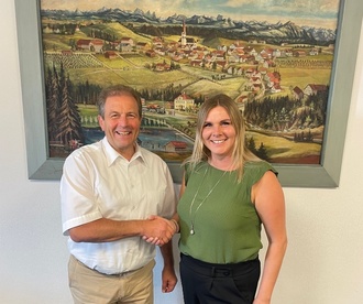 Bürgermeister Toni Barth begrüßt Sandra Pfahler offiziell im Rathaus Buchenberg und wünscht im Namen aller Kolleginnen und Kollegen einen guten Start sowie viel Freude bei der Arbeit.