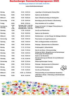 In den Sommerferien können Kinder ab 3 Jahren zahlreiche Programmpunkte in und rund um Buchenberg besuchen. Die Anmeldung zu den Veranstaltungen erfolgt in diesem Jahr wieder vorab per E-Mail, so dass die Buchung für die Eltern einfach und entspannt abläuft.
