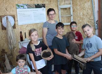 An 4 Stationen (Kuhstall, Hühnerstall, Schafweide und Spinnstube) lernten die Schüler viel über das Leben und Arbeiten mit Kühen, Kälbern, Hennen und Schafen kennen.