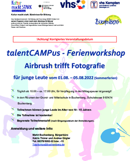 Eine kostenlose Ferienwoche bietet die Gemeinde Buchenberg gemeinsam mit der Volkshochschule Kempten in den Sommerferien vom 01. bis 05. August. Der TalentCampus ist für 10 bis 15 jährige und findet täglich von 10.00 bis ca. 17.00 Uhr (einschließlich kostenlosem Mittagessen) statt.