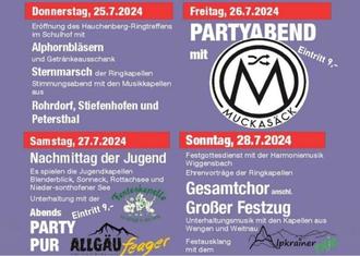 Das Highlight des Wochenendes ist der Festsonntag. Nach dem Gottesdienst wird die Reihenfolge der Ehrenvorträge aller Hauchenberg-Ring-Kapellen ausgelost. Der Gesamtchor findet am Haupteingang der Grund- und Mittelschule Buchenberg statt. Danach geht es im Festumzug durch Buchenberg zurück ins Zelt. Bei anschließender Unterhaltungsmusik mit den Musikkapellen aus Wengen und Weitnau wird das Festwochenende langsam zu Ende gehen. Zum Festausklang spielt das Alpkrainer Trio.