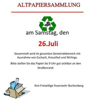 Buchenberg – Am Samstag, 26. Juli, findet die turnusgemäße Altpapiersammlung der Freiwilligen Feuerwehr Buchenberg statt. Die Bevölkerung wird gebeten, das Altpapier (bitte keine Pappe) gebündelt ab 9 Uhr am Straßenrand abzulegen. Gesammelt wird im gesamten Gemeindebereich mit Ausnahme von Eschach, Kreuzthal und Wirlings.