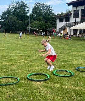 Im Mittelpunkt stand der vielseitige Wettbewerb, der die Kinder in Schnelligkeit, Ausdauer und Koordination forderte – und dabei vor allem eines im Blick hatte: Den Spaß an der Bewegung. Einen Teil des Wettkampfes bildete der Hindernisparcours, bei dem vor allem Schnelligkeit gefragt war. Mit viel Elan und Begeisterung überwanden die Schüler und Schülerinnen Hindernisse, sprangen, rannten und zeigten dabei, wie viel Power in ihnen steckte. Dass sie ihre Kraft auch über einen längeren Zeitraum gut einteilen konnten, zeigten die Kinder, indem sie sich - unter begeisterten Anfeuerungsrufen ihrer MitschülerInnen - beim fünfminütigen Ausdauerlauf tapfer durchbissen. Sprungkraft, Koordination und Konzentration war beim Geschicklichkeits-Parcours durch Reifen gefragt. Als weiterer Teil des Vielseitigkeit-Wettbewerbs war eine Zonen-Weitwurf-Station aufgebaut. Hier konnten die Kinder ihre Wurfkraft unter Beweis stellen und zielgerichtet in markierte Zonen werfen.