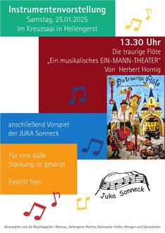 Dort erwartet Dich um 13:30 Uhr ein musikalisches Theater, in dem alle Instrumente vorgestellt werden. Im Anschluss gibt es Kaffee und Kuchen – musikalisch umrahmt von der JuKa Sonneck. Außerdem hast Du die Chance, selbst alle Instrumente auszuprobieren.