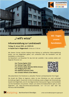 Und was bietet sich da heuer als aktuelles Thema an? Natürlich die bevorstehende Kommunal- und Landratswahl. Alle sechs Landratskandidaten(in) wurden eingeladen und haben auch zugesagt. Sie sollen zu aktuellen Themen im Landkreis Stellung beziehen und vor allem Fragen aus dem Publikum beantworten. Dabei wird auf ein gerechtes Procedere mit Zeitbegrenzung und faires Miteinander geachtet. Alle Kandidaten(in) haben auch Gelegenheit, sich persönlich vorzustellen sowie kurz zu referieren, für was sie stehen und wie sie die Zukunft des Landkreises sehen. Organisiert und moderiert wird die Veranstaltung von Ulrike Malcher, stellvertretende Vorsitzende des Diözesanverbandes Augsburg, Kornelius Wagner, Diakon der Pfarrei am Blender und Bezirkspräses, sowie Albert Müller, ehemaliger Kripochef und Kolpingmitglied.