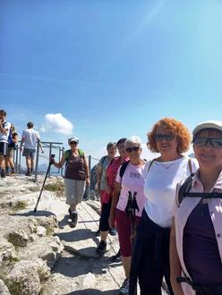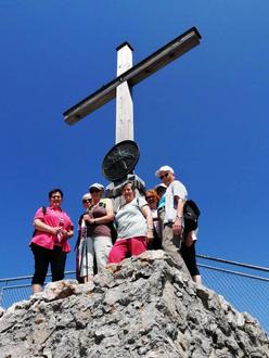 Die Angst in Warteschleife an der Nebelhornbahn zu kommen, bestätigte sich, trotz Sommerurlauber, nicht. Freundliche und auskunftsbereite Bearbeitung der Ticketabfertigung im neuen Terminal zur Nebelhornbahn. Bei bestem Wetter und guter Sicht konnten wir die Hochfahrt genießen. Oben angekommen bei angenehmen 21 Grad war es ein Bestaunen der doch so nahen aneinander gereihten Berggipfel. Die Natur ist ein Phänomen. Um das Gipfelkreuz ist ein neues begehbares Brückengeländer gebaut, sodass rundherum die prächtige Bergwelt zu sehen ist. Natürlich war es ein „Muss“ das Bergrestaurant zur Mittagspause zu besuchen. Die Auswahl unserer unterschiedlichen Menüs, war jedes fein und für das Auge wunderschön angerichtet. Hier konnten wir verweilen, das herrliche Panorama vor uns, lustig sein, unterhalten und die Zeit genießen. Zurück nach Oberstdorf runter, hier war noch , bei 31 Grad, angesagt und eine Einkehr in das Café Gerlach dort musste jeder von uns einen riesigen Eisbecher verzehren. Danach fuhren wir zurück nach Missen, Getrud Wegmann musste nach Hause in den Stall und kam zurück zum Gasthof Sonne, in Wilhams, hier hatten wir unser Abendessen bestellt und es kamen noch Bernadette Elgaß und Wilma Müller vom Seniorenteam hinzu, die beiden konnten leider tagsüber nicht dabei sein.