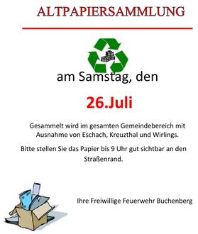 Buchenberg Am Samstag, 26. Juli, findet die turnusgemäße Altpapiersammlung der Freiwilligen Feuerwehr Buchenberg statt. Die Bevölkerung wird gebeten, das Altpapier (bitte keine Pappe) gebündelt ab 9 Uhr am Straßenrand abzulegen. Gesammelt wird im gesamten Gemeindebereich mit Ausnahme von Eschach, Kreuzthal und Wirlings.