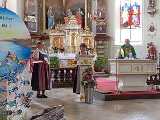 Mit der heiligen Messe wurde die Feier eröffnet, Pfarrer Joby Padayattil lies es sich nicht nehmen und sprach ein Grußwort, bevor er dann zu einer weiteren Feier nach Ermengerst aufbrach. Im Anschluß begrüßte die Vorsitzende Margit Merz die zahlreichen Gäste. Pfarrer Römer zelebrierte humorvoll und kurzweilig die heilige Messe. Musikalisch wurde der Gottesdienst von dem Gesangstrio Geschwister Speiser umrahmt. Zum Abschluß überbrachte Alexandra Zinth die Grußworte und ein Präsent der Kirchenverwaltung.