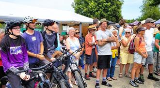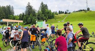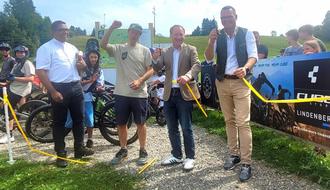 David Ziolko ist ziemlich stolz: „Wir haben unseren Traum verwirklicht“, strahlt der Vorsitzende des „Bergsportvereins Weitnau“, „eine große Anzahl von Ehrenamtlichen haben unendlich viele freiwillige Arbeitsstunden geleistet, um die drei neuen Trails in den Berghang zu legen, das ist einfach großartig.“ Bislang zog der Dorflift nur Skifahrer in die Höhe, doch die aufgrund des Klimawandels immer wärmeren und damit schneeärmeren Winter stellten den Betrieb infrage: „Zuletzt hatten wir gerade mal 10 Betriebstage, das rentierte sich nicht mehr“, so Ziolko. Die Idee „Bikepark“ kam den Weitnauern vor etwa fünf Jahren, die Gemeinde war ebenso davon angetan wie die Grundstückbesitzer. Flugs wurde der „Bergsportverein“ gegründet, der auch einige Sponsoren begeistern konnte. Rund 140.000 Euro kostete der Umbau, den Löwenanteil übernahm das europäische Regional-Förderprogramm „LEADER“: „Wir haben 51.000 Euro beigesteuert“, berichtet Andre Eckardt, erster Bürgermeister in Burgberg und an der Förderung beteiligt. Sein Weitnauer Kollege Schmid fand große Worte für die neue Anlage, sprach von einem „Meilenstein“, einem neuen „Tourismusmagneten“ und lobte die ehrenamtlichen Helfer: „Ihr habt ein Stück eurer und unserer Heimat neu gestaltet.“