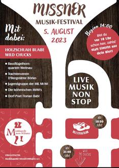 Die Musikkapelle Missen-Wilhams hat wieder ein schönes Rahmenprogramm zusammengestellt: Freuen wir uns auf die musikalischen Darbietungen des Bassflügelhornquartett Weitnau, der Jugendgruppe der Musikkapelle Missen-Wilhams und der böhmischen MiWi´s. Die Reime und Sprüchle vom Sibratshofer Dorfpoet Florian Babl und die Auftrittte des örtlichen Trachtenvereins D´Bergstätter Börlas runden den Nachmittag ab bevor ab 18 Uhr die „Holzschuah Buabe“ für gute Unterhaltung sorgen. Gegen Abend, genauer ab 21 Uhr geht es „Non Stop“ weiter – mit den „Wild Chucks“ die dem Missner Musikfestival 2023 ein hoffentlich tolles Finale und Party bis in die Nacht bereiten.