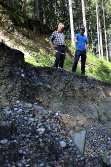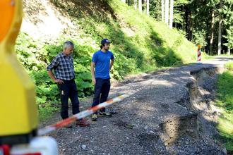 Rainer Kiehstaller (links) von der örtlichen Wegebaugemeinschaft und Förster Sebastian Seifert (rechts) begutachten den Schaden an einem Forstweg bei Wengen.