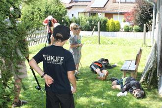 Insgesamt neun Kinder im Alter zwischen 9 und 12 Jahren haben bei hochsommerlichen Temperaturen beim Ferien-Filmworkshop mitgemacht. Unter der Regie von Nachwuchs-Filmemacher Lukas Heinle und Profi-Kameramann Hubert Jäger wurde an einem halben Tag der kurze Spielfilm „Die Erfindung des Professor A“ abgedreht.