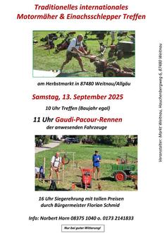 Das beliebte Internationale Treffen der Motormäher und der Schlepper mit einer Achse findet wieder unter der Leitung von Norbert Horn statt. Rattern und knattern wird es beim „Gaudi-Rennen“ ab 11 Uhr, wenn die Teilnehmer auf der kleinen Wiese den „Gaudi-Parcours“ ausführen.