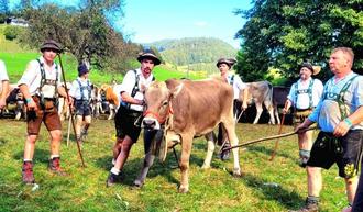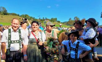 Geschafft: Elena und Luggi freuen sich mit Bürgermeister Florian Schmid(li) und der festlich bekränzten Leitkuh über einen unfallfreien Alpsommer