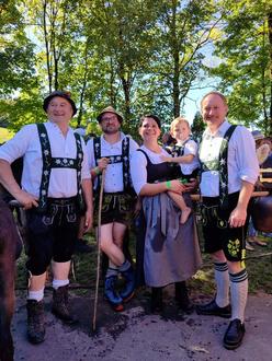 Freuen sich über einen gelungenen Alpabtrieb: German Sutter, Alpmeister Andreas Reichart, Elena Dornach mit Sohn, Bürgermeister Florian Schmid