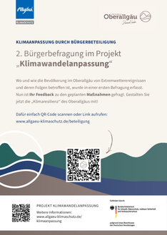Um die erarbeiteten Maßnahmen zu bewerten und weiter zu präzisieren, lädt der Landkreis alle Bürgerinnen und Bürger ein, sich an der zweiten Befragung zu beteiligen. Die anonyme Umfrage umfasst zehn Fragen, dauert etwa sieben Minuten und ist unabhängig von der Teilnahme an der ersten Befragung. Sie ist bis zum 31. Januar 2025 unter www.allgaeu-klimaschutz.de/beteiligung abrufbar.