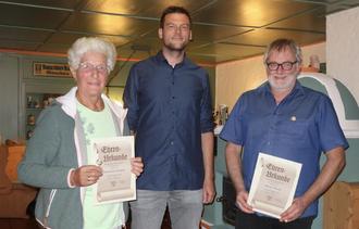 1. Vorsitzender Alex Warnke überreichte Hannelore Kaspar und Rainer Hitzler das goldene TV Weitnau Abzeichen für ihre 50 jährige Mitgliedschaft