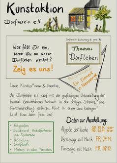 Ihr wolltet schon immer mal eure Kunstwerke ausstellen, hattet aber keine Plattform? Oder ihr möchtet gerne mal bei einer Ausstellung dabei sein, da ihr eine spannende Idee zum Thema " Dorfleben" habt? Dann seid ihr herzlich eingeladen, an unserer Kunstaktion teilzunehmen.