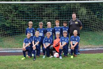 Auch die D-Jugend ist von der neuen Spielkleidung von der Zimmerei Stötter begeistert, die Matze Stötter überreichte.
