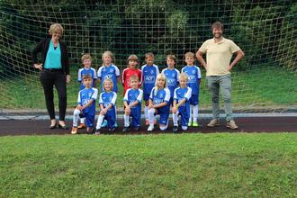 Die F-Jugend freut sich über Trikots von der Firma AOT, die Nici und Fabian Breisinger übergaben.