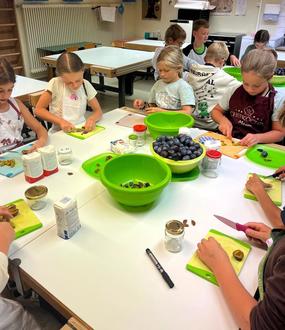 Hoch oben im Schulgarten hängen sie in voller Pracht, unsere Zwetschgen. Ganz so einfach war die Ernte diesmal nicht, denn der Baum ist inzwischen so groß, dass man fast eine Leiter bis zum Mond bräuchte. Doch unsere findigen Viertklässler ließen sich davon nicht aufhalten: Bewaffnet mit einem Obstpflückgerät von Oma und viel Teamgeist ging’s den Zwetschgen an den Kragen! Im WG-Unterricht wurden die prallen Früchte dann in köstliche Zwetschgenmarmelade verwandelt. Es wurde geschnippelt, gerührt und natürlich auch ein bisschen genascht (Qualitätskontrolle ist schließlich wichtig). Am Ende durfte jedes Kind ein kleines Gläschen der selbstgemachten Leckerei mit nach Hause nehmen, zum Frühstück, zum Verschenken oder einfach zum Stolzsein.