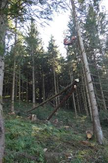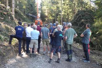 Auf Einladung der beiden Obmänner Bernd Hörmann (OV Wengen) und Hermann Walk (OV Weitnau) kamen am Freitag, 19.09.25, bei herrlichem Wetter die Waldeigentümer und Mitglieder der WBV Westallgäu zum Waldbegang. Schwerpunktthemen waren die Holzernte im steilen Gelände mit Seilbahnunterstützung sowie der Waldumbau. Aktuell gut auskömmliche Rundholzpreise und die staatliche Förderung machen die dringend notwendige Durchforstung in steilen Lagen wirtschaftlich möglich. Wenn nicht jetzt wann dann. So werden reine Fichtenbestände durch die Seilbahntrassen und die Entnahme qualitativ schlechter und wenig vitaler Bäume zugunsten besserer und vitalerer strukturiert und stabilisiert. Verringerung des Betriebsrisikos und Einleitung des Waldumbaus sind dabei die Ziele.