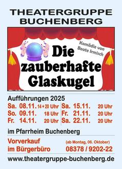 Der Kartenvorverkauf für „Die zauberhafte Glaskugel“, so der Titel des diesjährigen Stückes der Theatergruppe Buchenberg, ist bereits in vollem Gang. Ebenso die Proben. Bis zu dreimal wöchentlich treffen sich die Laiendarsteller und feilen an der Inszenierung, damit für das treue Publikum wieder ein gelungener Theaterabend mit herzhaften Lachern sowie lustigen und hintersinnigen Sprüchen gesichert ist.