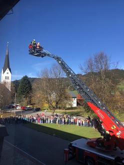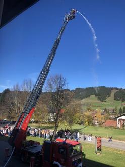 Die Schulklasse wurde in Sicherheit gebracht und zwei Personen über die Drehleiter gerettet. Außerdem wurde den Kindern eine Löschübung demonstriert.