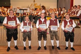 In diesem feierlichen Rahmen wurden zahlreiche Musiker geehrt. Eine Auszeichnung für zehn Jahre aktives Musizieren erhielten Karin Baldauf, Tobias Bischof, Luis Denz, Pius Denz, Fabian Rist, Alexander Spieß und Rebecca Theobald. Manuela Herz durfte sich über die Auszeichnung für 25 Jahre freuen. Peter Appelt, Hubert Baldauf, Thomas Müller, Peter Pfitzenmaier und Heinrich Vogel wurden für 50 Jahre musikalische Aktivität ausgezeichnet.